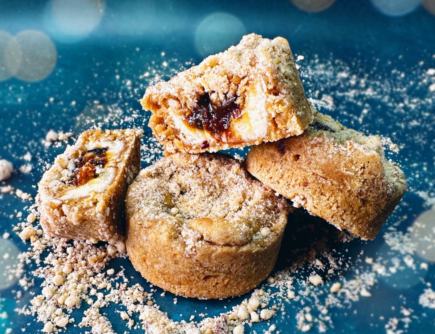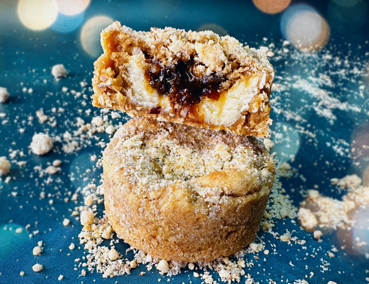 A lightly spiced oaty cookie stuffed with brandy butter mince pie infused filling topped with dark sugar crumble